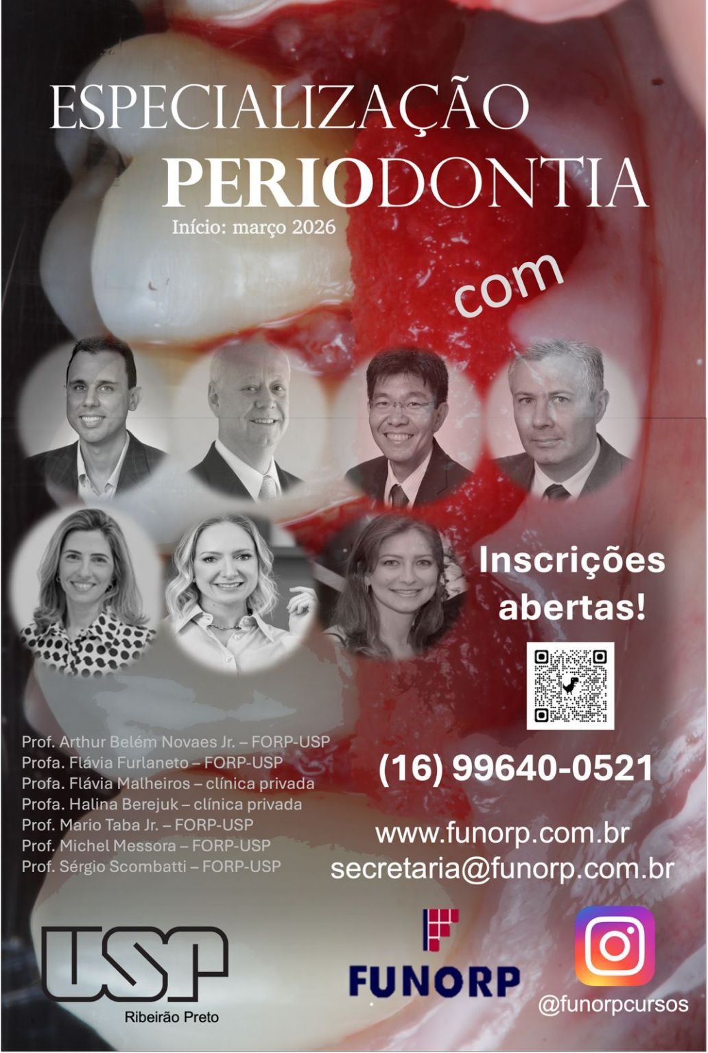 Estamos iniciando a abertura das inscrições para NOVA TURMA. É um curso da Universidade de São Paulo (Diploma pela USP), registrado no CFO (apenas 12 alunos por turma), ministrado por professores doutores, livre-docentes e titulares, todos também pesquisadores.