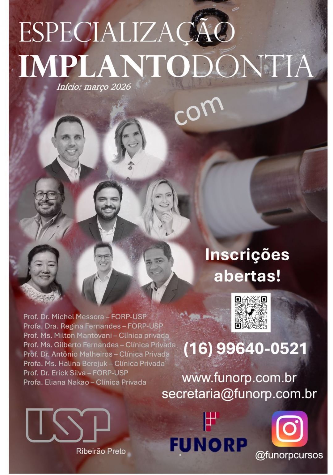 Estamos iniciando a abertura das inscrições para nova turma. É um curso da Universidade de São Paulo (Diploma pela USP), registrado no CFO (apenas 12 alunos por turma), ministrado por professores doutores, livre-docentes e titulares, todos também pesquisadores.